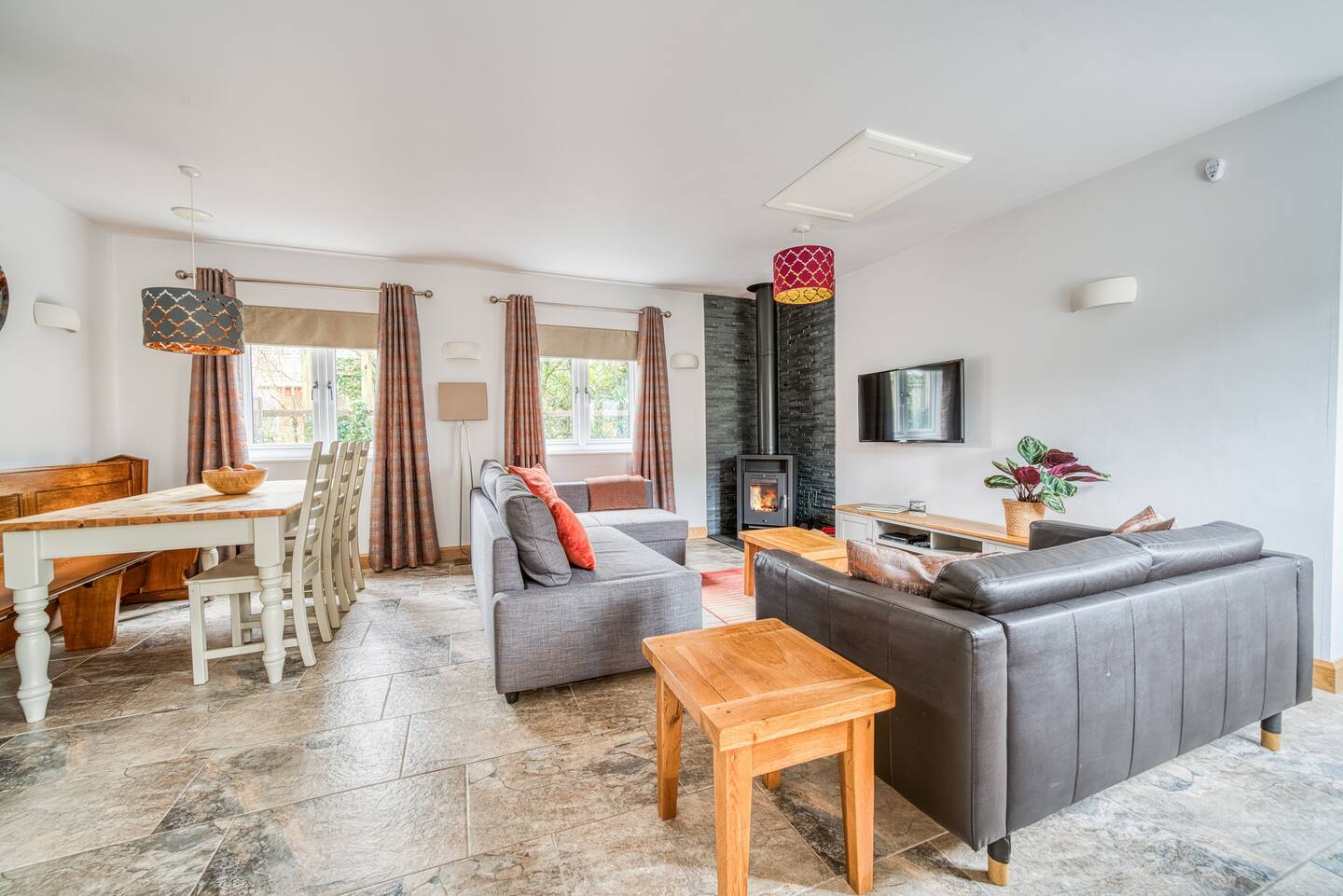 The fully-equipped kitchen makes meal prep easy, whether you’re cooking a Sunday roast or whipping up a quick snack. It includes plenty of pots and pans, an oven with grill, electric hob, large fridge/freezer, and a dishwasher. For your convenience, dishwasher tablets, washing-up liquid, and tea towels are provided. We also stock milk, tea, sugar, ground coffee, and a cafetiere to help you settle in right away. The dining table comfortably seats six, perfect for sharing meals and conversation.