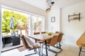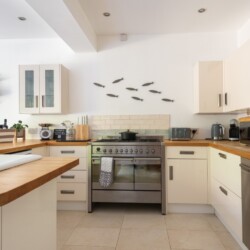 - Open-Plan Kitchen/Diner: A fantastic sociable space! The kitchen boasts a gas range cooker with electric oven, air fryer, dishwasher, American-style fridge/freezer, microwave, Dolce Gusto coffee machine, and an Alexa Smart Speaker. The dining area offers a breakfast bar with two stools and a dining table with seating for up to eight guests.